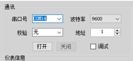 設備通過RS485-USB轉換器和電腦連接,在配置軟件中選擇正確的端口號,設備默認波特率為9600,校驗:無。設備連接后重啟電源,然后在軟件界面通訊面板點擊打開按鈕,