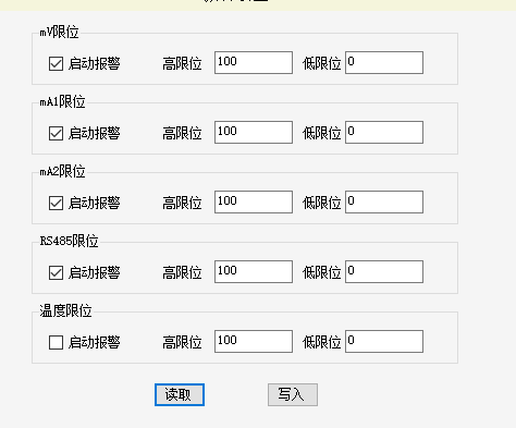設置每通道的報警信息,報警上下限、打開和關閉。