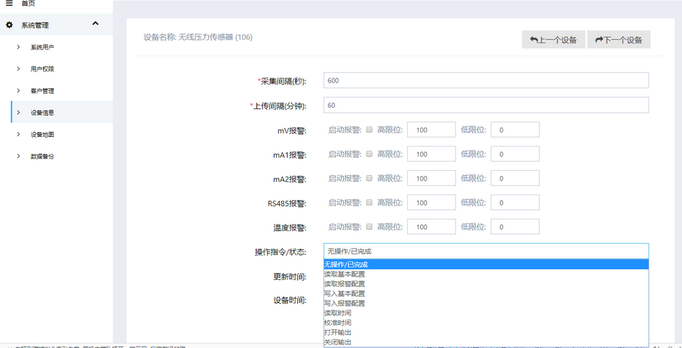 4、遠(yuǎn)程配置:采集頻次/發(fā)送頻次/告警上下限等參量遠(yuǎn)程配置,上傳間隔時間設(shè)定比較長時,可利用設(shè)定采集間隔的時間來監(jiān)控數(shù)據(jù),MCU當(dāng)監(jiān)控到數(shù)據(jù)超過設(shè)定的上下限閥值時,即使沒達(dá)到上傳時間,設(shè)備也會主動上傳報警數(shù)據(jù)。