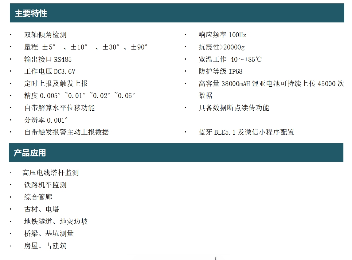 PTH-QJ06低功耗無(wú)線傾角傳感器、無(wú)線傾角計(jì)為一款高性能高集成的智能低功耗產(chǎn)品,其是一款基于4G/GSM傳輸?shù)膬A斜角度測(cè)量設(shè)備,具有其獨(dú)特性、創(chuàng)新性、高集成性,該產(chǎn)品選用目前最新的全網(wǎng)通物聯(lián)網(wǎng)無(wú)線芯片,配套物聯(lián)云平臺(tái)實(shí)現(xiàn)遠(yuǎn)程數(shù)據(jù)采集、監(jiān)控、分析、巡察、報(bào)警、歸類、地理位置定位、數(shù)據(jù)報(bào)表曲線下載,手機(jī)等移動(dòng)設(shè)備APP軟件實(shí)現(xiàn)隨時(shí)隨地監(jiān)控報(bào)警等功能的產(chǎn)品。采用標(biāo)準(zhǔn)的MODBUS/TCP標(biāo)準(zhǔn)通訊協(xié)議,該款產(chǎn)品以微處理器為核心,能可靠的實(shí)現(xiàn)傾角、水平位移、電量等信號(hào)的采集和處理,可實(shí)現(xiàn)數(shù)據(jù)定時(shí)上報(bào)及觸發(fā)上報(bào)等功能。